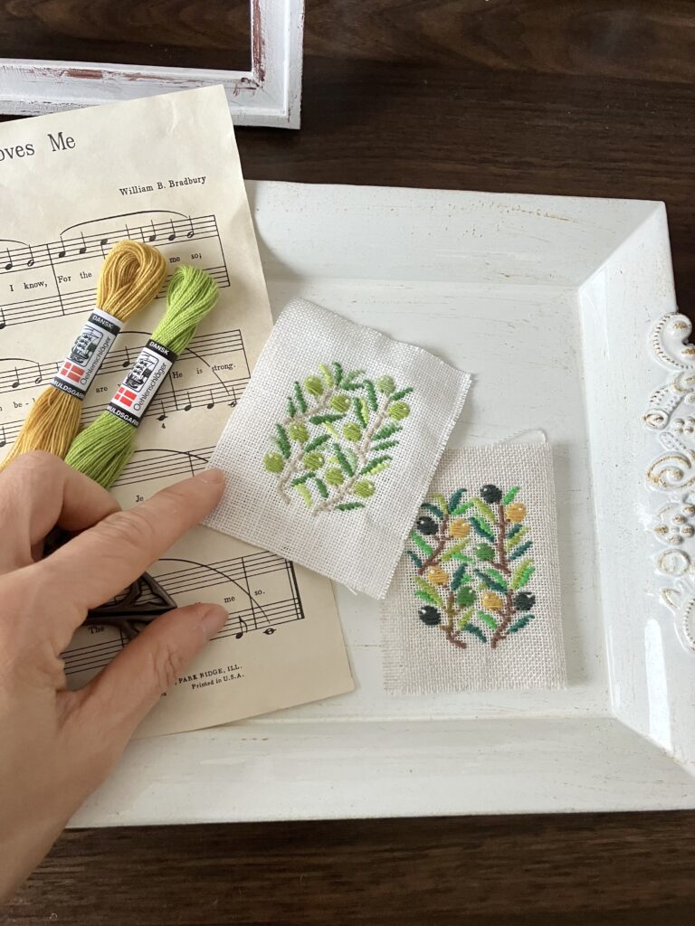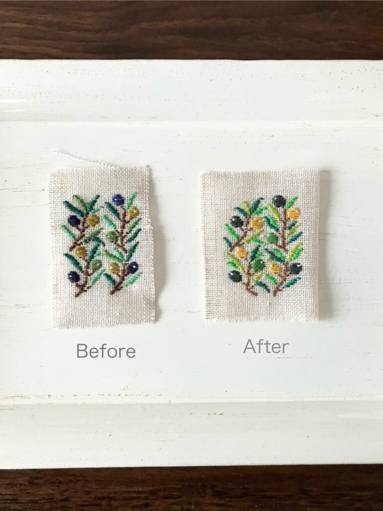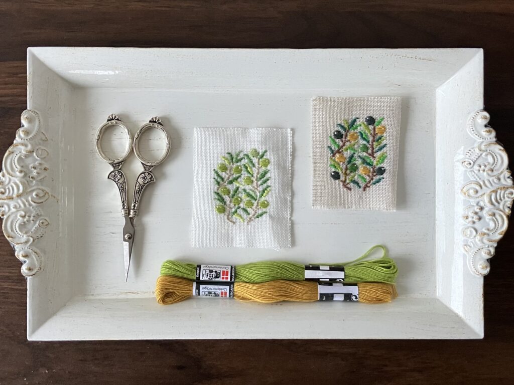 そしてたどり着いた今回の青い実のオリーブ刺繍は、