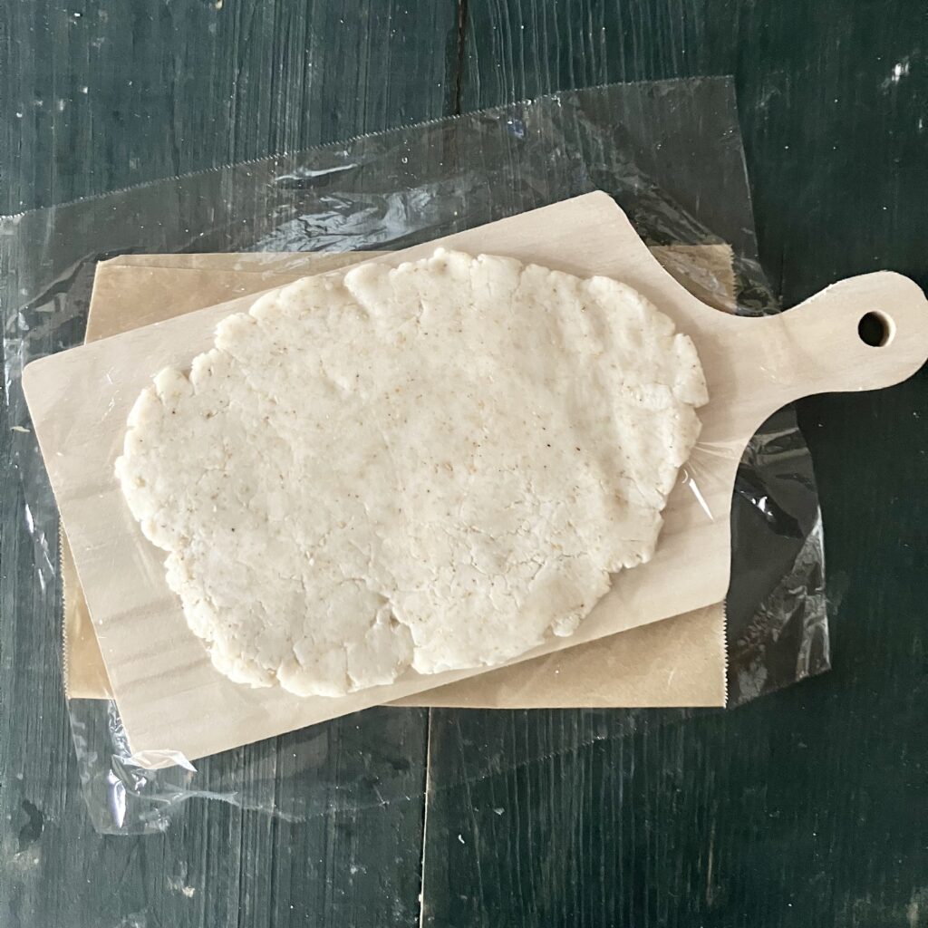 6. まな板などの上にサランラップを敷いて生地を乗せ、
